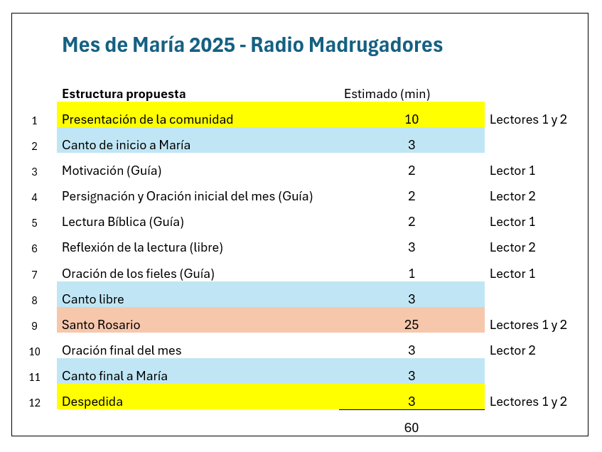 Cada Comunidad nombrará 2 encargados para guiar la oración del día. Para ello proponemos el siguiente esquema (si bien cada Comunidad es libre de usar su esquema propio):